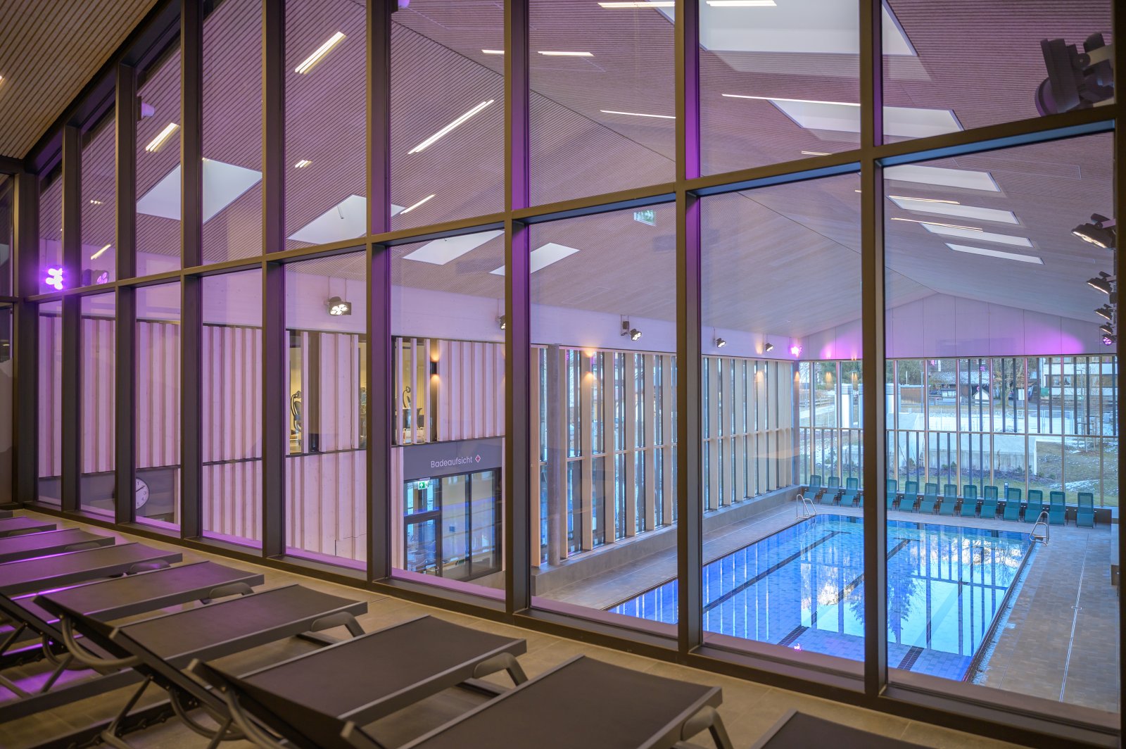 Im Zentrum steht die weitläufige Badewelt, die mit einem 25-Meter-Becken für Sportliche und einem spektakulären Infinitypool aufwartet, von dem aus man den freien Blick auf die Allgäuer Gipfel genießt. Das Wassererlebnis wird durch verschiedene Entspannungsbecken und einen kleinen kinderfreundlichen Bereich ergänzt.